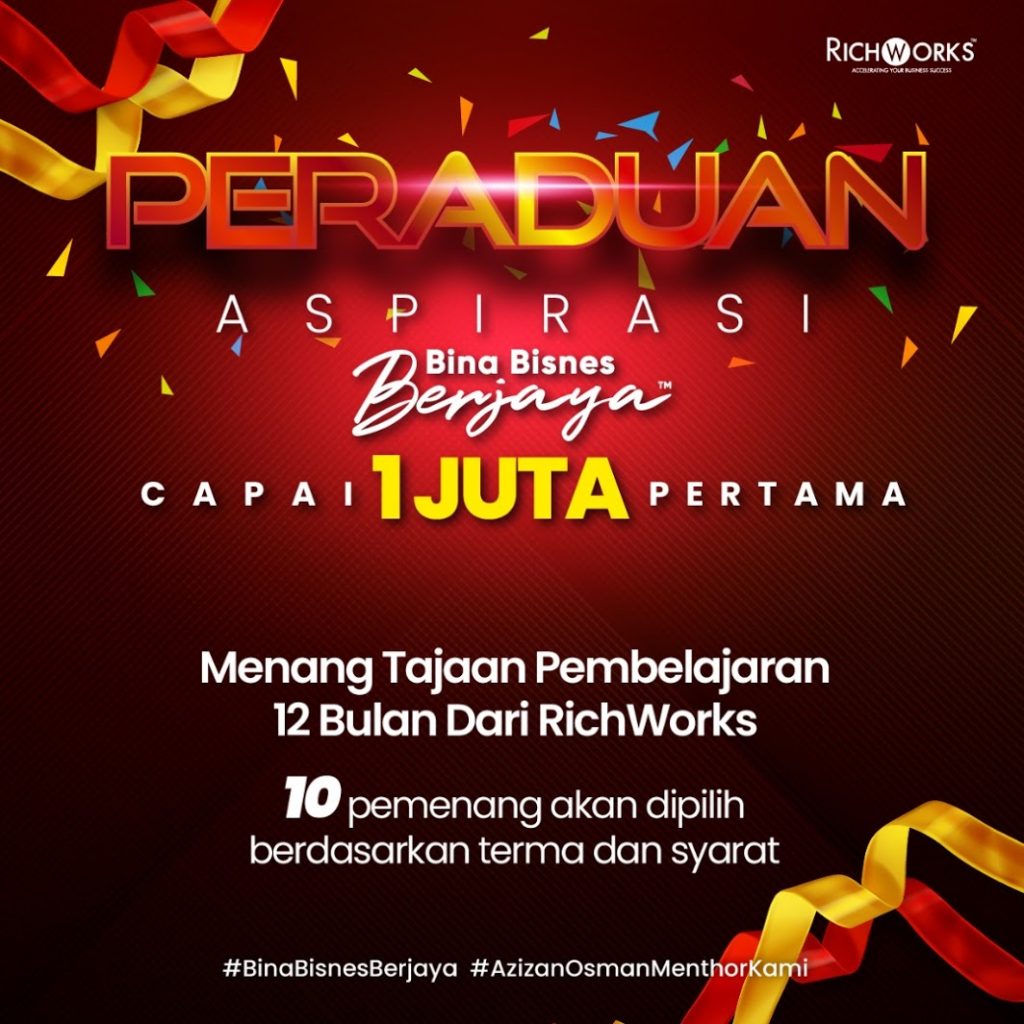 RichWorks juga ingin memberi tajaan bimbingan perniagaan Mentorship di RichWorks kepada 10 Usahawan bertuah untuk dilahirkan menjadi jutawan dalam tempoh 6 bulan ke 1 tahun. Syarat untuk mendapatkan tajaan, usahawan perlu memiliki perniagaan sendiri dan jualan sebulan sekurang-kurangnya RM 30,000. Pemohon hanya perlu menghantarkan tulisan tentang cita-cita perniagaan dan aspirasi anda untuk capai RM1 juta pertama. Pemohon yang terpilih akan ditemu ramah oleh pihak RichWorks.