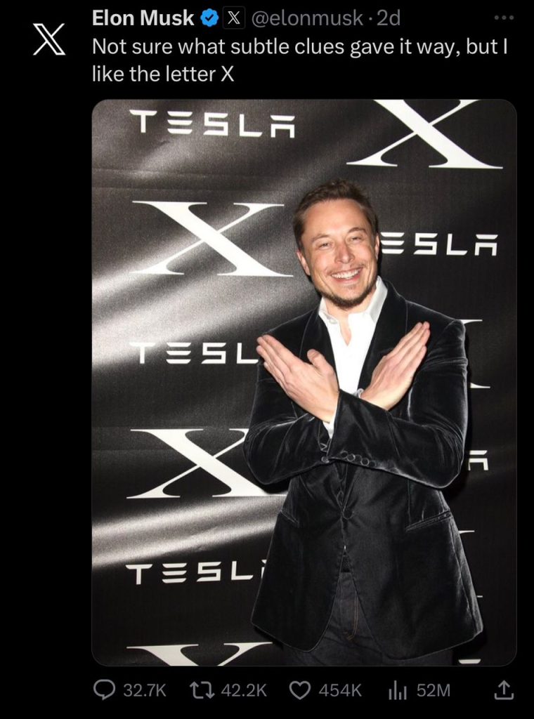 Musk telah menulis banyak tweet berkenaan dengan penjenamaan semula Twitter kepada X, satu huruf yang beliau gunakan berulang kali dalam nama syarikat dan produknya selama-lamanya.