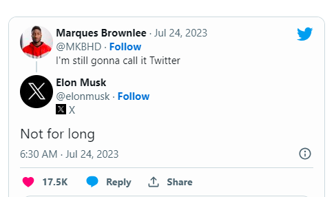 Marques Brownlee, yang menggunakan platform itu sejak tahun 2009 berkata bahawa dia masih akan memanggilnya Twitter, yang mana Musk membalas, “Tidak lagi selepas ini.”